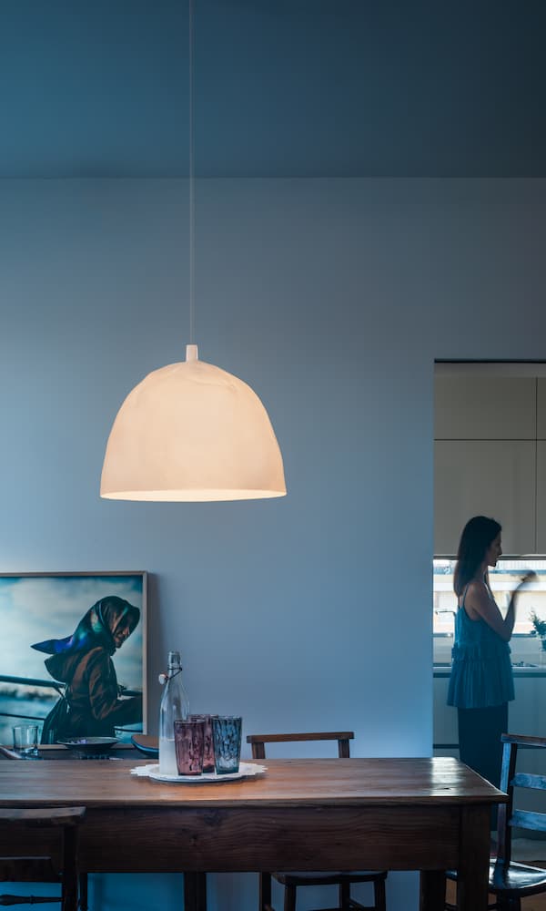 The Bump suspension lamp was created in 2020 for Foscarini by designer duo Ludovica + Roberto Palomba. It has a dome-shaped shade with a dented
