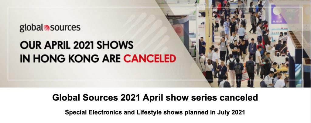 (March 4, 2021 – Hong Kong) In light of the risk of the COVID-19 pandemic, restrictions and quarantine requirements relating to international travel, and concerns for public health and safety, Global Sources is regretfully announcing the cancelation of the Global Sources 2021 April show series, rescheduling to run in October, 2021.